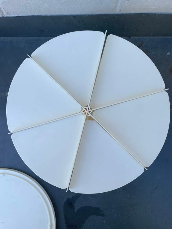 - De caroussel heeft gebruikssporen als een paar breukjes in de bakken en één deksel mist een puntje (zie foto's)