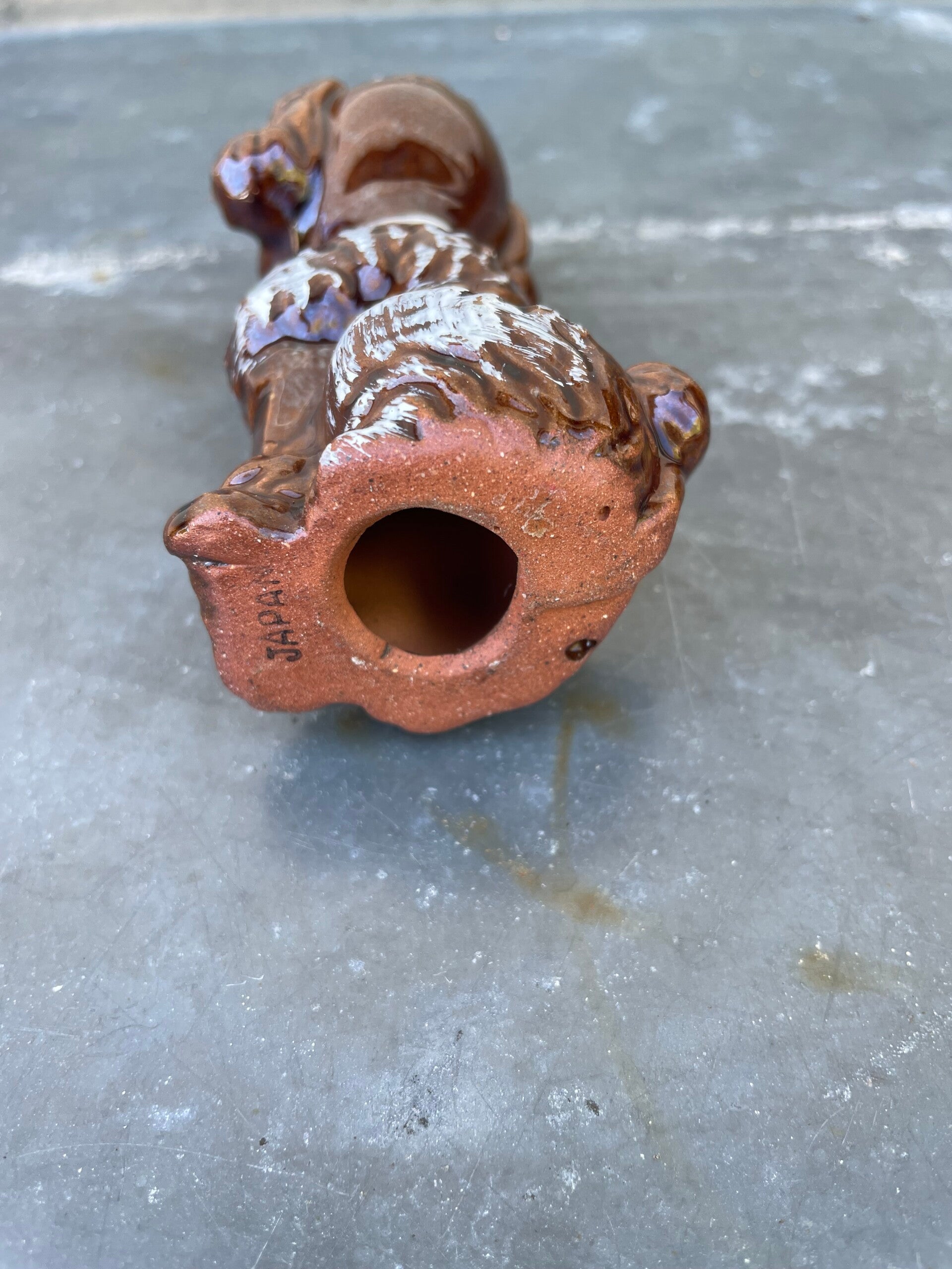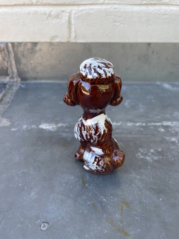 Schattig beeldje in glanzend bruin glazuur met wit accenten, blauwe oogjes en een rood neusje en tongetje