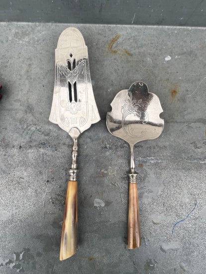 - De linker is een vis- of taartschuif: opengewerkt en gegraveerd met sierlijke lijnen en bladeren