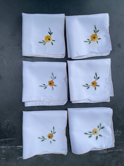 - De bloemen op de servetten zijn gestempeld in oker en groen