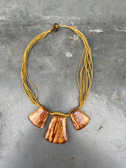 - Afrikaans aandoende ketting gemaakt van houten hangers, 11 strengen van okerkleurige touwtjes en een houten knoopje
