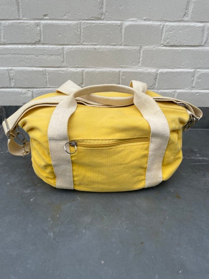 - De tas is gemaakt van stevig lichtgeel canvas, met armhengsels van ivoorkleurig band, typerend gestikt rondom de tas