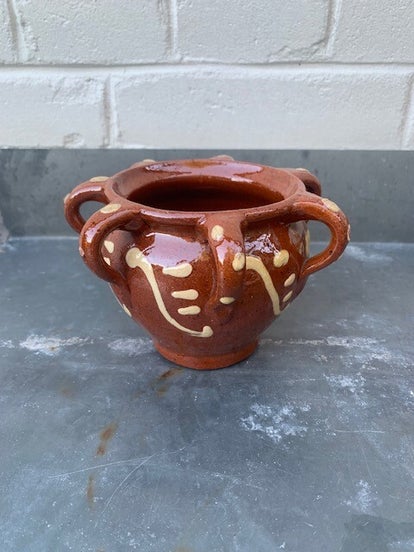 - Herkenbaar aan de bruin gekleurde klei, glanzend geglazuurd met ringeloor decoraties in dikke verf