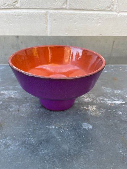- Binnenzijde donkerbruin en langs de bovenrand nachtblauw/drip glazuur