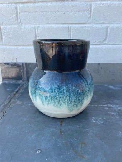 - Strak vormgegeven pot met (drip) glazuur in ivoor, aqua en amber over een terracotta ondergrond