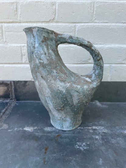 - Handgevormde schenkkan/vaas in lichtblauw/grijze glazuur aangebracht met een soort kam waardoor een streepachtig effect ontstaat met daarna zand bestrooit