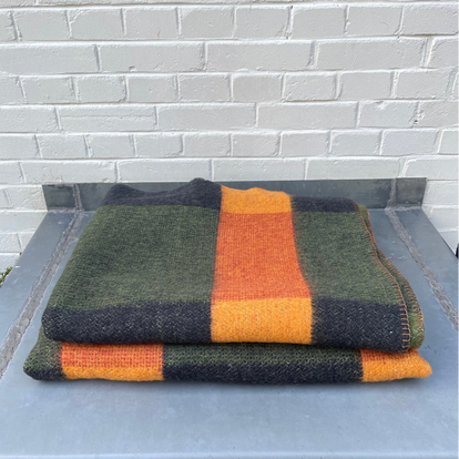 - Een geruiten deken in herfstkleuren: donker blauw, donkergroen, cognac, roodbruin en zwart